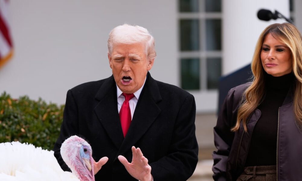 Donald Trump presided over the annual Thanksgiving turkey pardon ceremony at the White House on November 21, 2025, granting clemency to a turkey named Gobble while...